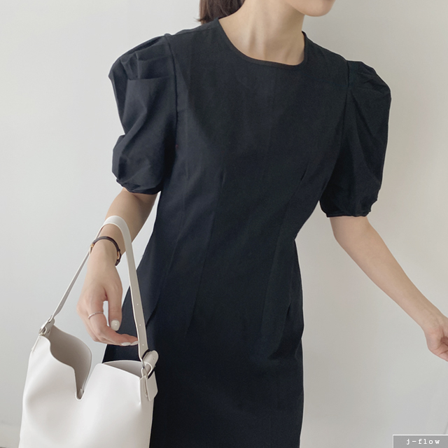 에드나 라운드넥 퍼프 코튼 롱 원피스 (화이트,블랙) 여름 반팔 A라인 핀턱 무지 하객룩