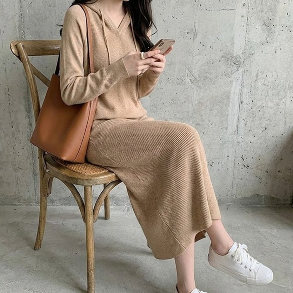 에이멀 니트원피스 여성 가을 겨울 H라인 캐주얼 편한 후드 꾸안꾸 데일리룩 골지 롱원피스