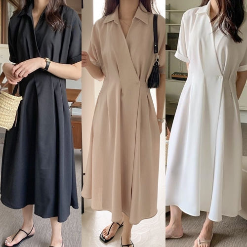 여름 원피스 지지미 카라 단추 A라인 롱 원피스 빅사이즈